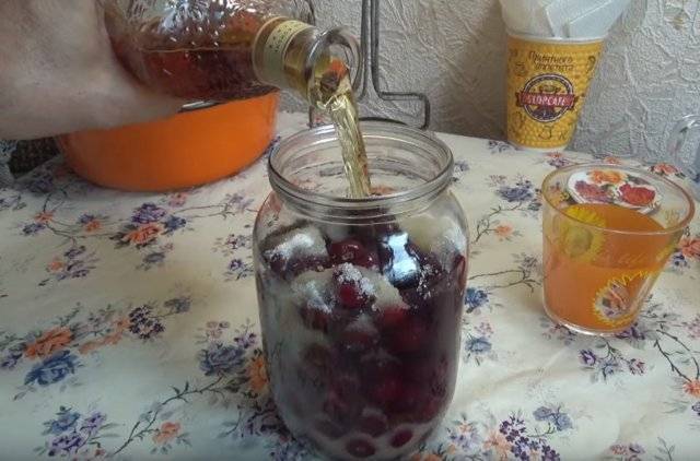 - Вишню вымыть, обсушить, разложить в банки, пересыпая сахаром (сахар должен быть на дне и поверх вишни).