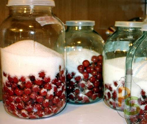 - Укладывание продукта в банку и пересыпание его сахаром (пересыпать надо слоями).
