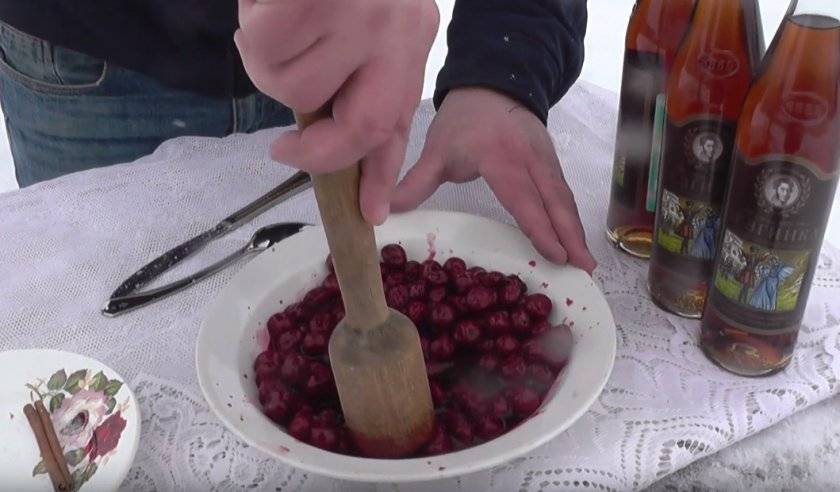 Высыпаем вишню в емкость, в данном случае кастрюлю и разминаем ее до состояния пюреобразной массы. Можно растолочь толкушкой или еще каким-либо подручным кухонным инструментом.