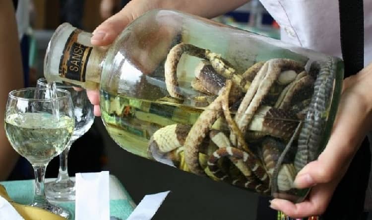 Есть и другой вариант напитка — желчь, кровь змеи и другие составляющие просто добавляют в бокал с вином или водкой. Такой коктейль выпивают залпом. Компоненты из рептилии берут пока она живая.