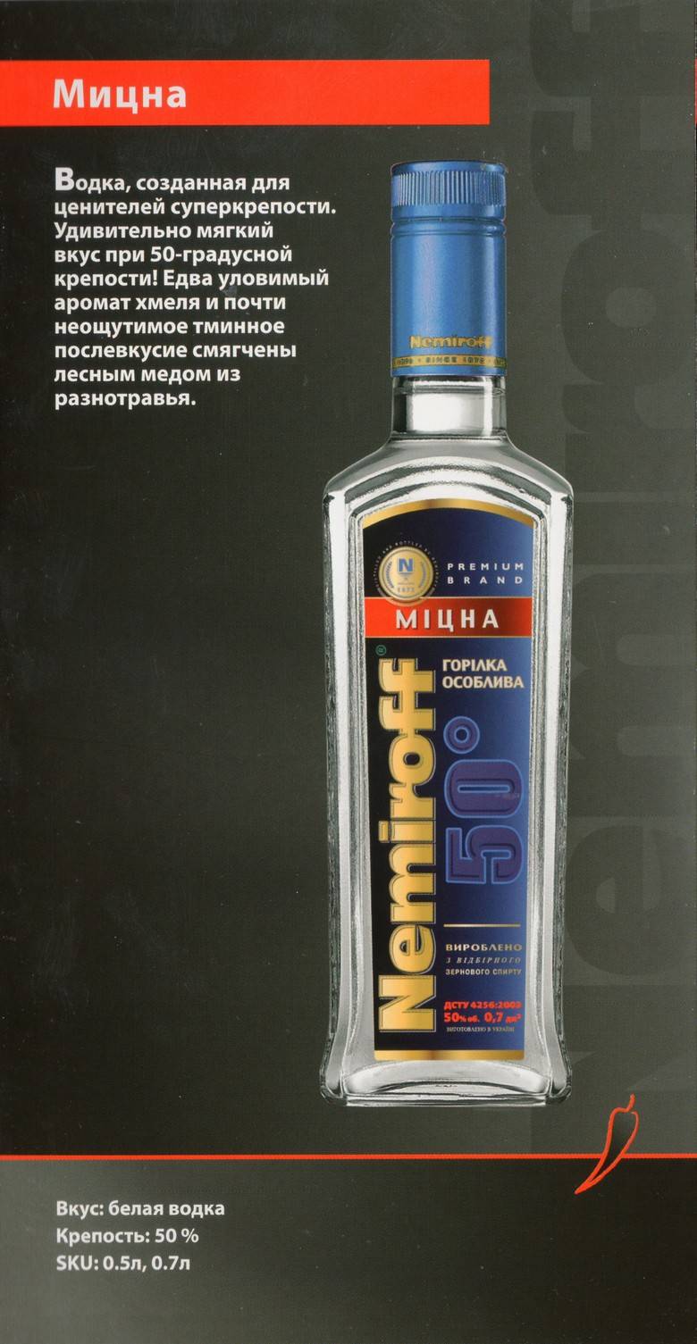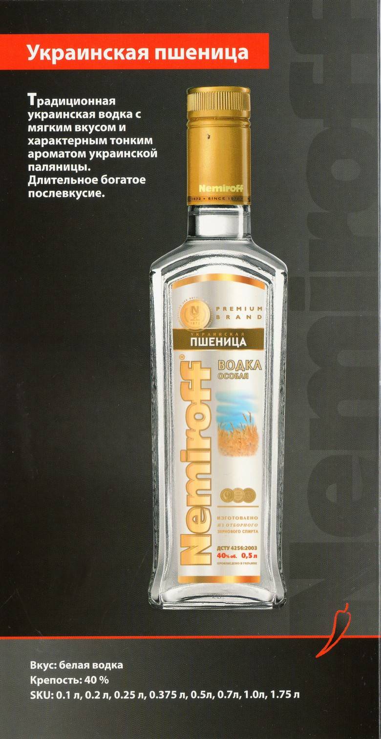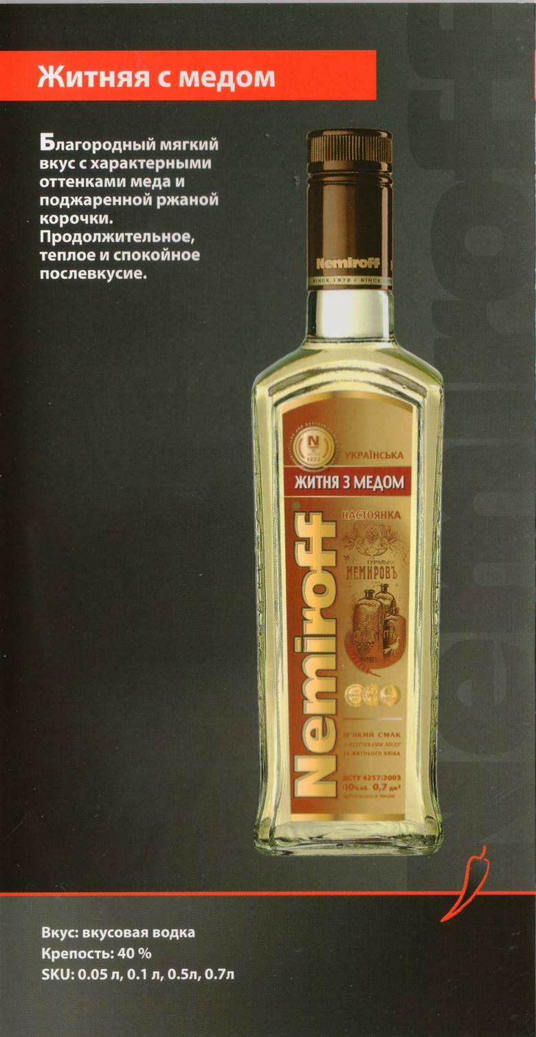 Пожалуй, расскажем о наиболее известной и полюбившей публике водке Nemiroff. Во-первых, это водка «Украинская медовая с перцем». Говорят, что она похожа на пылающий нектар.:)