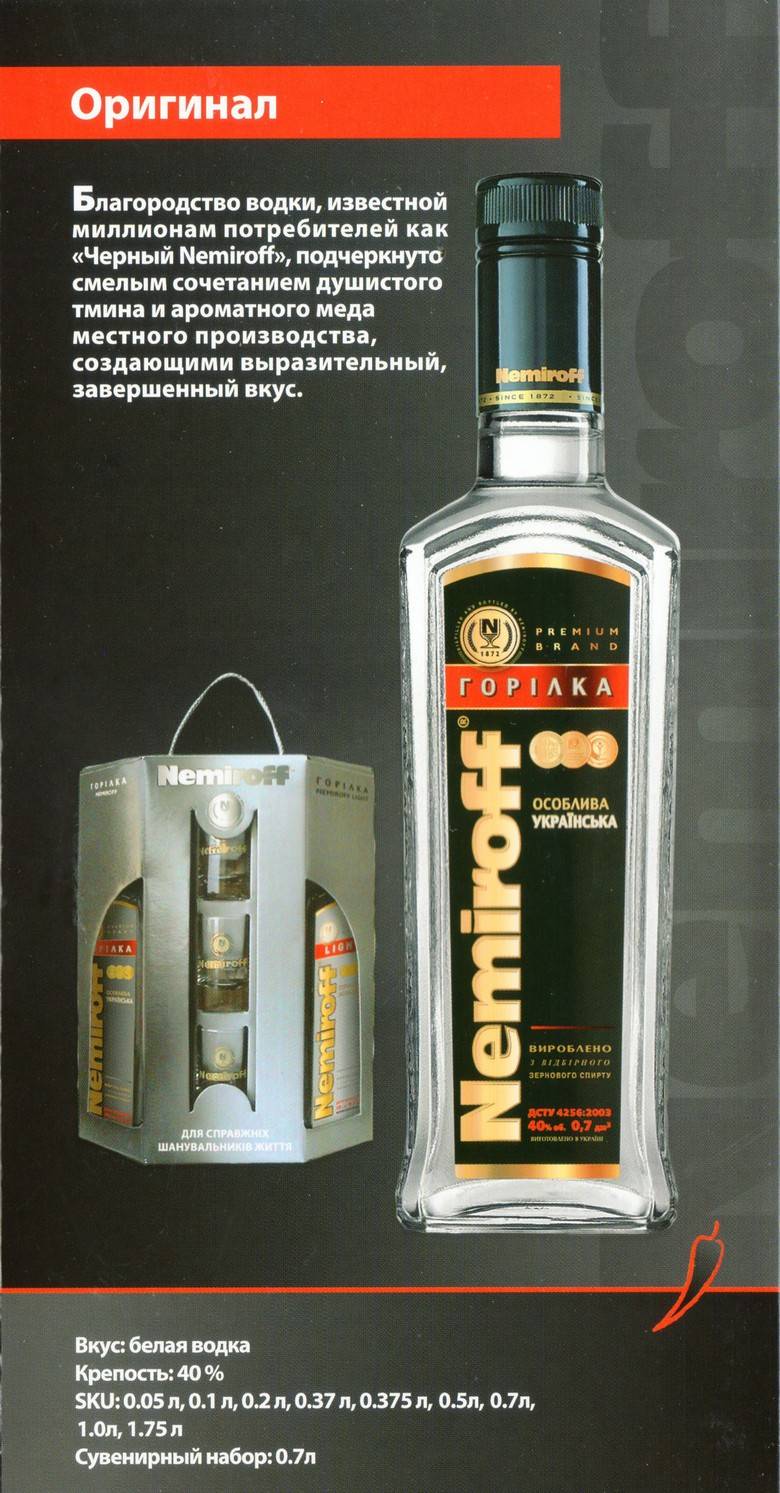 Каждому из нас хотя бы раз в жизни приходилось сталкиваться с сим, однако не каждый знает, откуда он появился и как давно. Итак, свое название водка Nemiroff берет от одного украинского города Немиров. Когда-то в далеком 1872 году местный помещик с фамилией Строганов открыл винокуренный завод, отличительной чертой которого было производство напитков очень высокого качества. Прошли года, и завод приобрел славу супертехнологичного современного предприятия. Удивительно то, что завод по производству водки Nemiroff не отличается большими размерами, но, что является отличительной чертой, это предприятие максимально независимо. Говорят, что пшеницу для изготовления водочных изделий, выращивают на этом же самом предприятии, тщательно ухаживая и заботясь о ней. По мнению экспертов, производство такого напитка, как водка Nemiroff, достойно носить славу предприятия XXI века. Известно, что там работают только с высококлассным зерновым спиртом класса «люкс» или «экстра». На всех этапах производства организован многоступенчатый контроль качества. На начальной этапе обработку проходит даже вода путем прогона через все мыслимые и немыслимые фильтры. Может быть, вами приходилось слышать, что для очищения спирта его прогоняют через активированный уголь. Так вот, на заводе протяженность фильтров из активированного угля равняется 28 метрам.