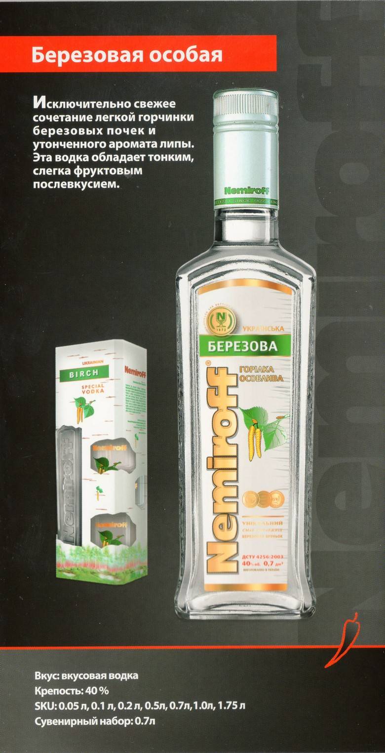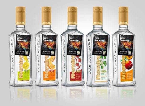 - В категории «масс-маркет» выпускается: Nemiroff Light, Delicat, Оригинал, Березовая Особенная, Клубника с перцем, Медовая с перцем, Деликат Янтарь.
