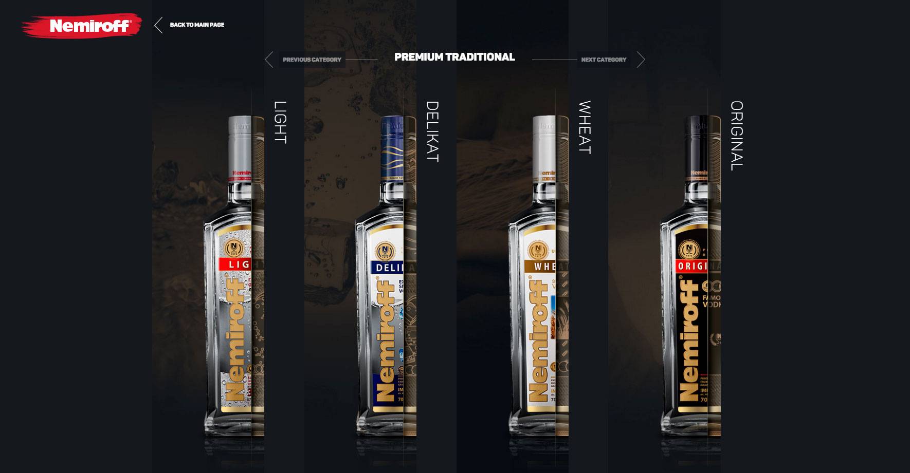 - В категории премиальных напитков представлены: 40%-ная водка Nemiroff Premium De Luxe с тонким, тепло-свежим сбалансированным вкусом, а также 37,5% крепости Nemiroff Premium Cranberry с ароматно-ягодным оттенком и древесно-пряными вкусовыми нотами. В составе премиальных напитков самая чистая вода и «люксовые» спирты, а также уникальная фильтрация и натуральные ингредиенты (мятная композиция в первом случае и клюква —о втором).