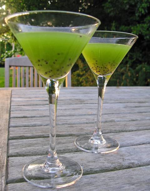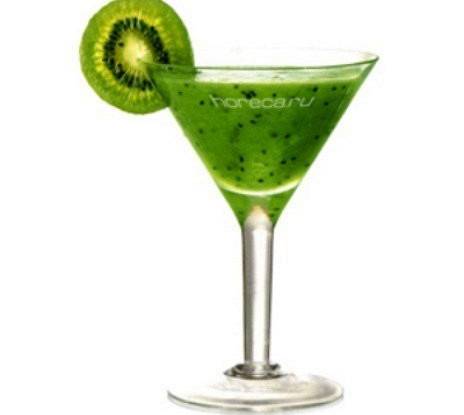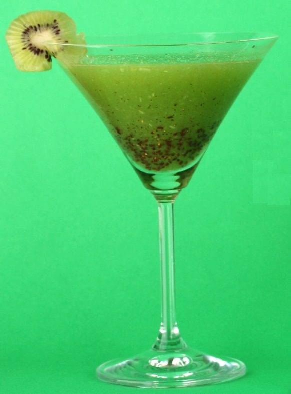 - Перелить готовый коктейль в бокал для мартини или коктейльную рюмку. Для этого нужно использовать ситечко, чтобы черные зернышки киви не попали в бокал.