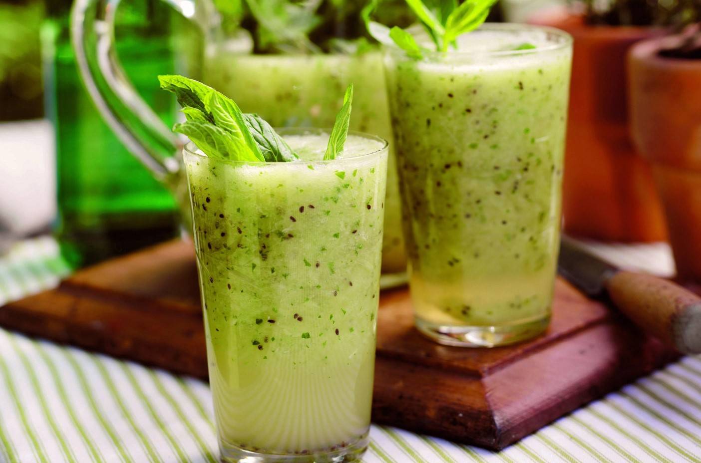 - Напиток украшают ломтиками киви и веточкой мяты;