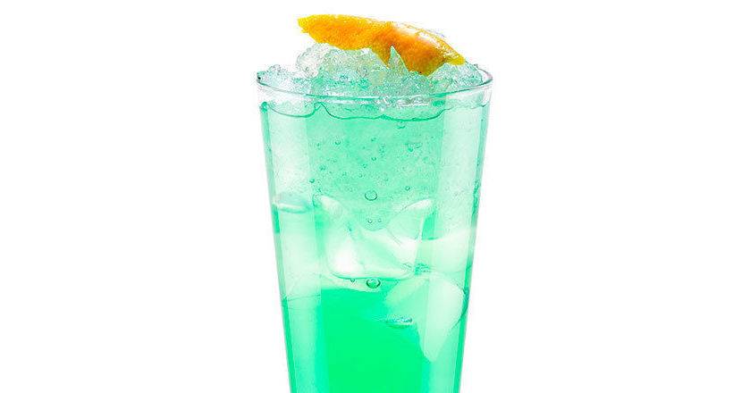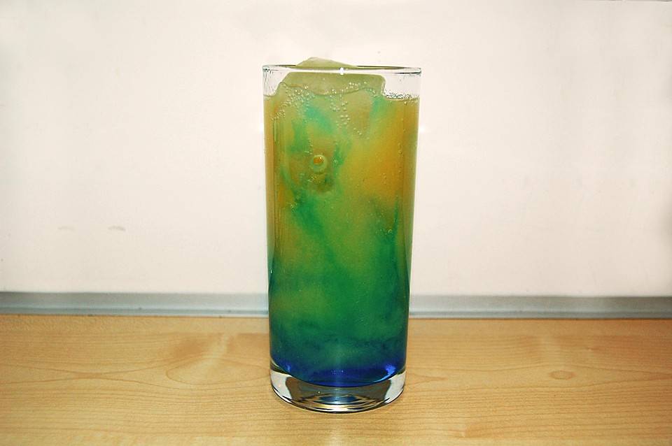 - Затем ко льду наливают водку, белый ром, текилу, ликер Блю Курасао и ликер из дыни. Последним наливают абсент, чаще всего используется абсент Ксента. Количество спиртного зависит от предпочтений клиента, как правило, все напитки наливают в равных пропорциях, в количестве до 20 мл.