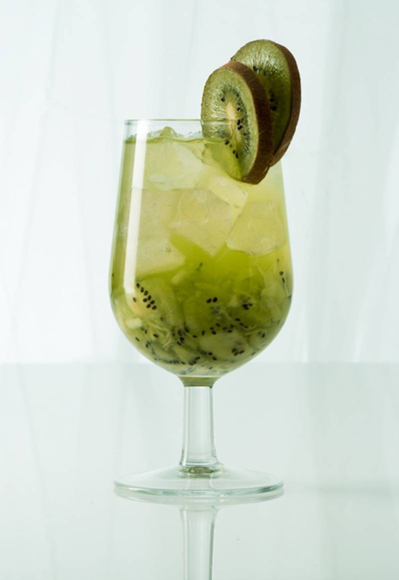 - Перелить готовый коктейль в бокал через специальное ситечко (стрейнер), чтобы избавиться от зернышек киви.