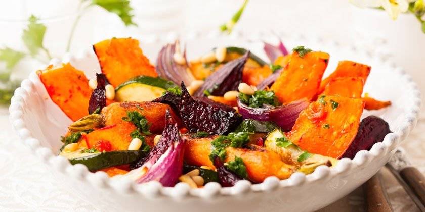 Вкусный, легкий аппетитный салат из запеченных овощей может стать любимым блюдом диетического стола. Для его приготовления свеклу надо предварительно отварить, остудить, снять кожицу, тыкву – очистить, нарезать дольками и испечь в духовке до готовности. Для более выраженного вкуса тыквы ее можно запекать с медом, а свеклу – не варить, а испечь вместе с тыквой. Готовые овощи измельчить: свеклу натереть на свекольной терке, тыкву – нарезать кубиками. Ингредиенты перемешать, посолить, заправить лучше оливковым маслом.