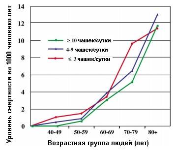 Дальнейшее исследование показало также и снижение риска сердечно-сосудистых заболеваний. Среди употребляющих свыше 10 чашек в день (в сравнении с 3 чашками в сутки) средний рост продолжительности жизни для мужчин и женщин составил 3,8 и 4,3 года соответственно.