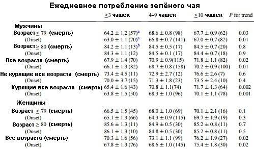 Более того, у тех, кто пил по крайней мере 4 чашки (960 мл) в день, инфаркт возникал реже, чем у тех, кто не пил зеленый чай ().