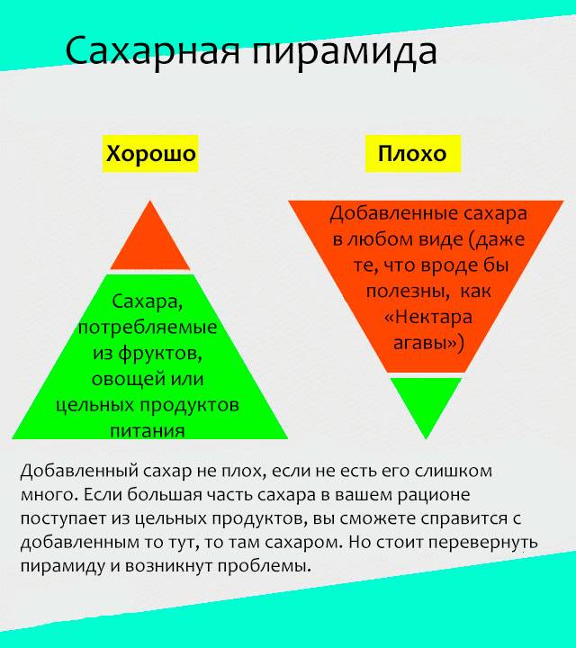 Основу здоровой сахарной пирамиды составляют овощи и фрукты: они не только насыщают, но и обеспечивают организм клетчаткой, витаминами, минералами и фитохимическими веществами (биологически активные соединения, обнаруженные в растениях, некоторые из которых полезны для нашего здоровья), в дополнение к сахару. Можно также сюда включить цельное молоко. Небольшое количество естественного сахара, встречающегося в хлебе, также не считают добавленным, но вот сахар, который часто добавляют при производстве в США считается таковым.