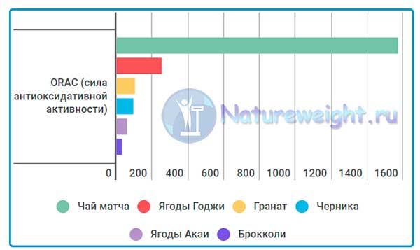 По силе антиоксидатовного действия, измеряемого в единицах ORAC (емкость поглощения свободных радикалов кислорода) чай матча в десятки раз превосходи другие популярные источники антиоксидантов, например, чернику.