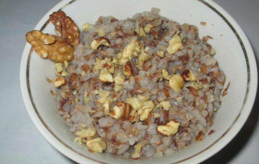 - пока каша настаивается или накануне приготовления блюда, полстакана очищенных грецких заливают кипятком на 20-30 минут;