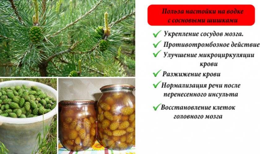• В определенных источниках попадается информация, что настойка с использованием сосновых шишек на водке является одним из наиболее эффективных средств при предупреждении и восстановлении после инсульта. Состав шишек дает возможность в существенной степени сделать лучше состояние человека, но только в случае комплексной терапии. Осложнения инсульта бывают крайне опасными и во время обширных повреждений, целиком восстановить здоровье лишь задействуя натуральные средства фактически не представляется возможным.