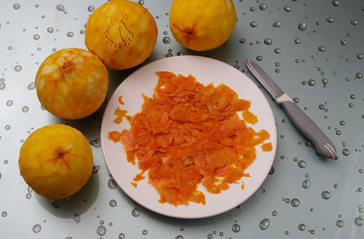 Совет! Мякоть — самая вкусная часть апельсинов – в этом рецепте нам не понадобится, однако, ее можно с успехом пристроить по назначению. Апельсиновые дольки можно просто съесть или пустить на сок, из которого при вашем желании и небольших усилиях получится замечательное апельсиновое желе.