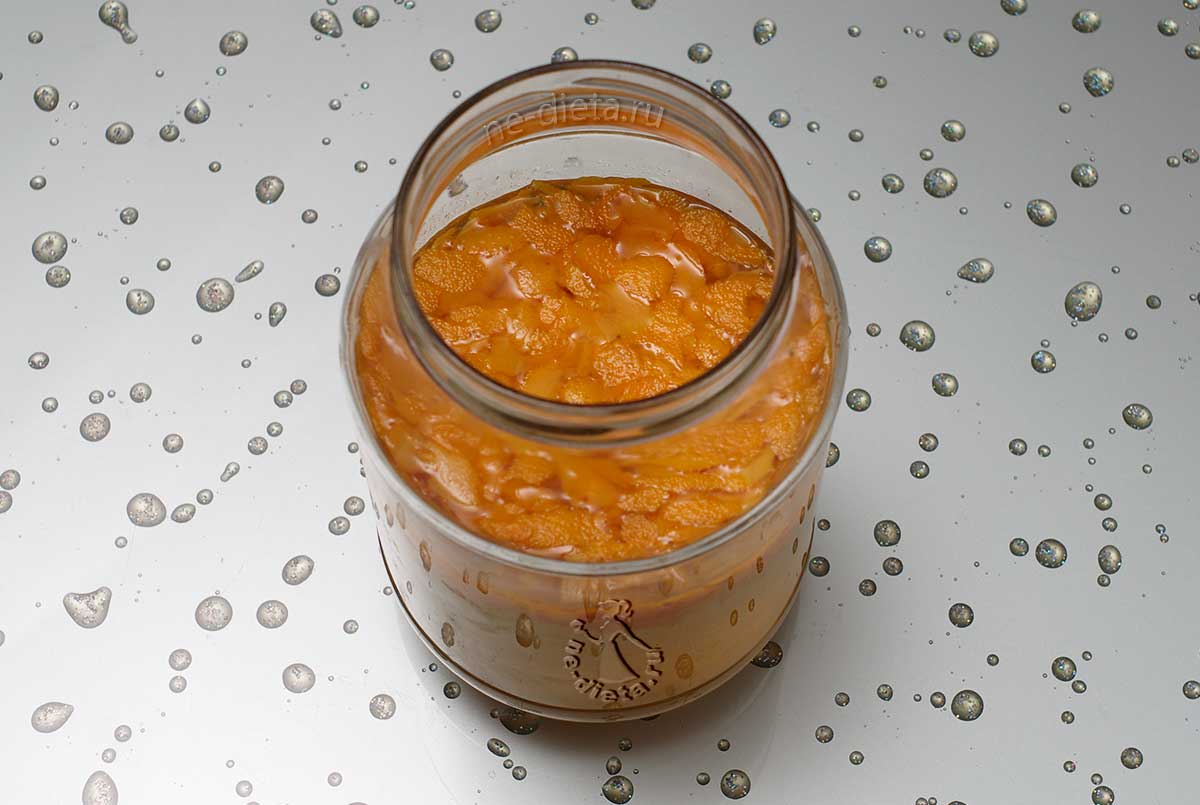 На дно чистой стерилизованной банки кладут всю оранжевую нарезку.