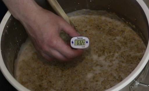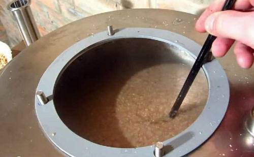 Спустя 1,5 часа огонь выключают, а заготовку остужают до 65 градусов. Пока солод остывает его следует перемолоть и добавить воду температурой 28 градусов. Таким образом получается солодовое молочко, которое следует использовать в течение суток.