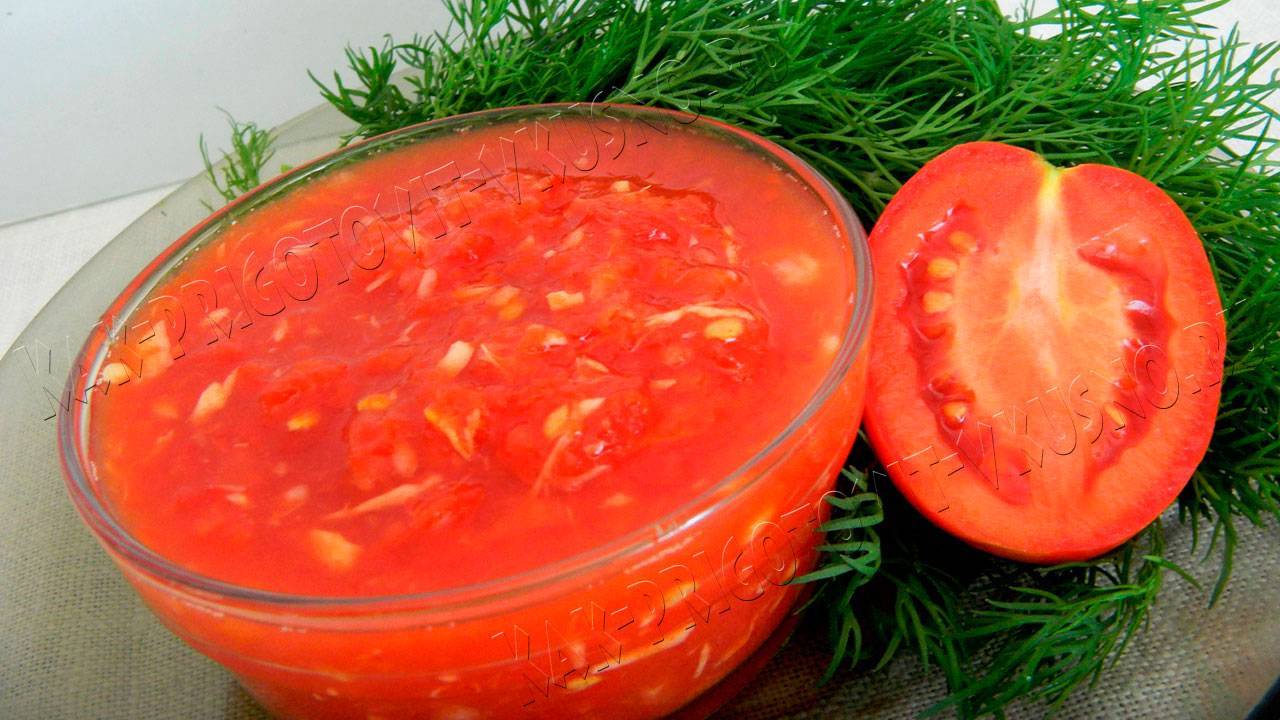 - ведро спелых томатов (если требуется меньшее количество закуски, то необходимо уменьшать все составляющие в соответствующих пропорциях);