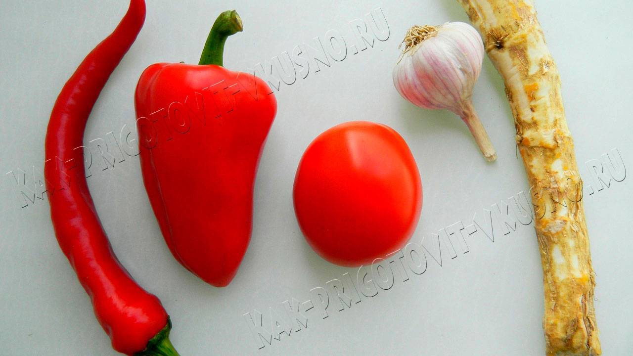 Чтобы приготовить домашнюю хреновину на зиму, нам понадобятся свежие помидоры, корень хрена, свежий чеснок (это обязательные ингредиенты), а также немного соли и сахара, которые можно добавлять или нет.