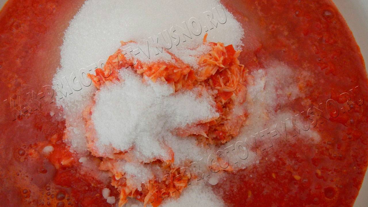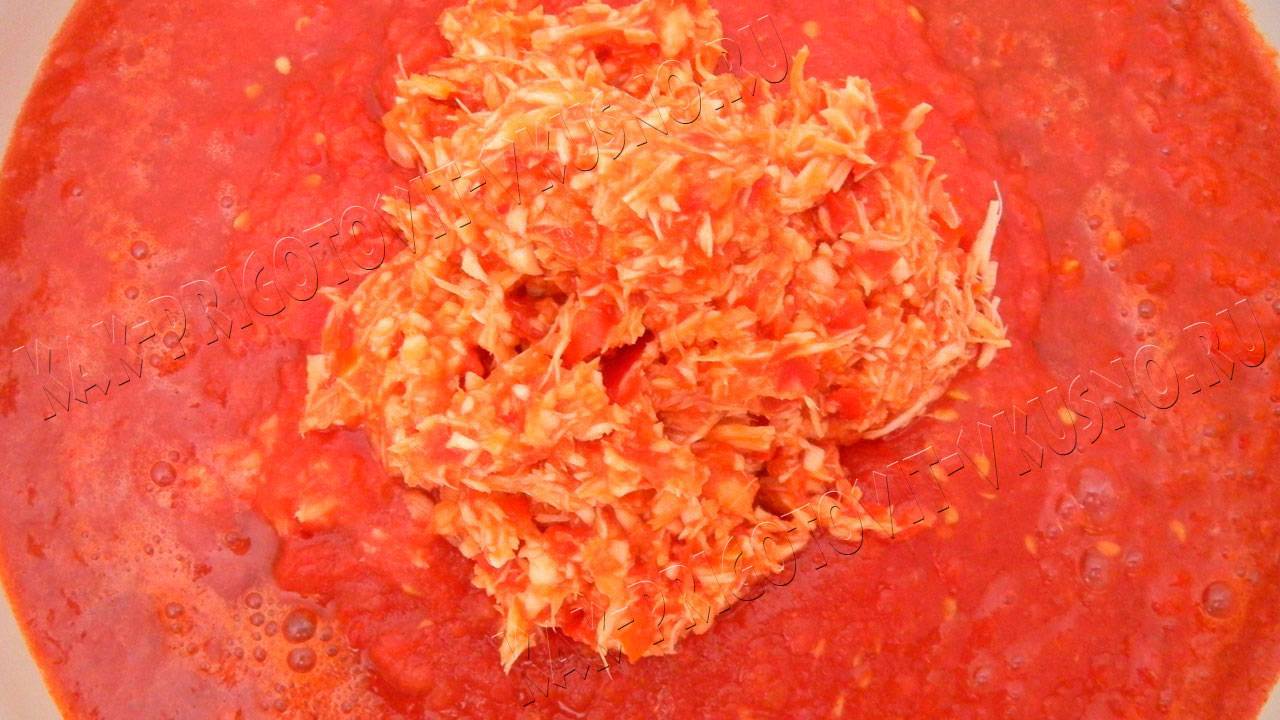 Если томаты были не самые спелые, то хреновуха может получиться с кислинкой и в этом случае лучше добавить немного сахара. Хрен, чеснок и острый перец перекрутите с помощью комбайна, а если вы решили воспользоваться мясорубкой, то слезы вам гарантированы – уж очень едкие и агрессивные испарения будут исходить от ингредиентов для соуса. Что касается пропорций, то они такие: на 6 л томатной массы нужно взять: