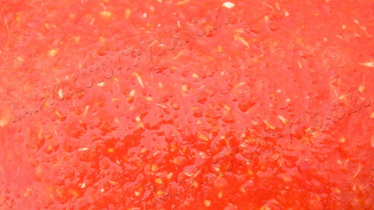 - 13 литров перекрученных помидор перекладываем в большую посудину. Ставим на огонь – варим полчаса.