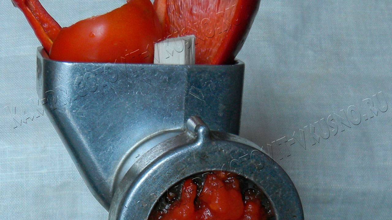 И, наконец, очередь свежих томатов — их тоже пропускаем через мясорубку вместе с кожицей и семенами.