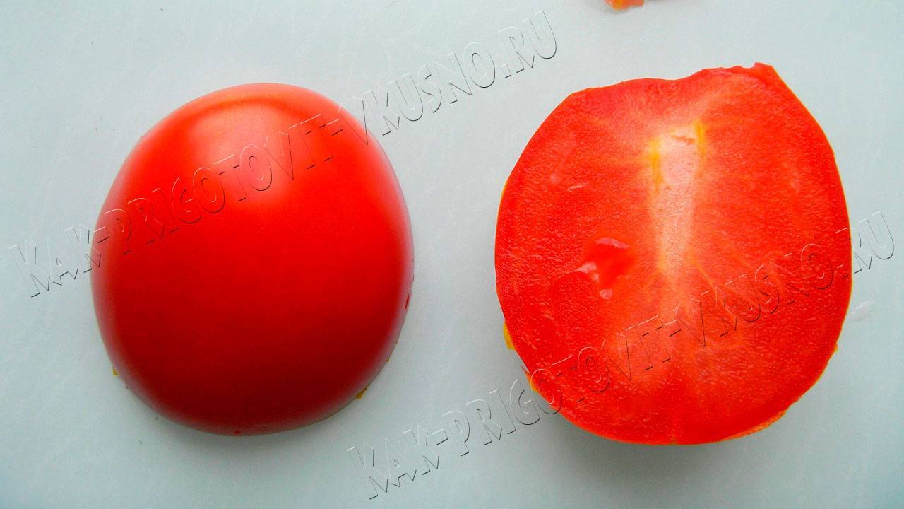 Для этого рецепта взять красные спелые помидоры, разрезать на половинки и отрезать место соединения помидора с черенком.