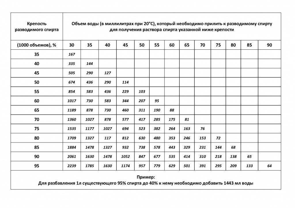 Правильно развести водой спирт, чтобы получить напиток нестандартной крепости, поможет таблица, на которой представлены нужные пропорции.