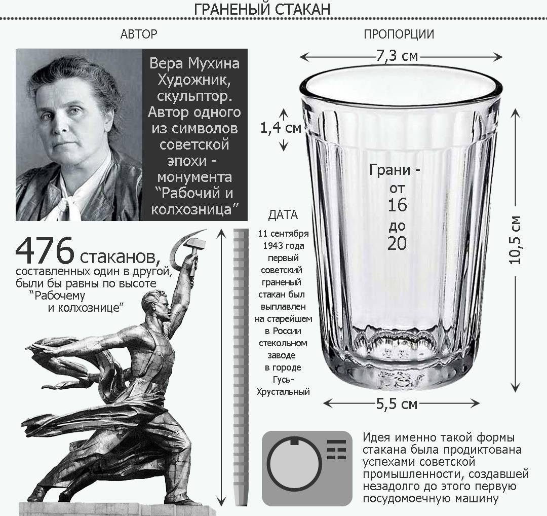 1. Советский граненый стакан создал скульптор. По крайней мере, так считается, что дизайн именно для этого стакана разработала известный советский скульптор, создательница знаменитого монумента «Рабочий и колхозница» Вера Мухина. По одной из легенд, она создала этот «шедевр» стеклянной посуды в блокадном Ленинграде в 1943 году.