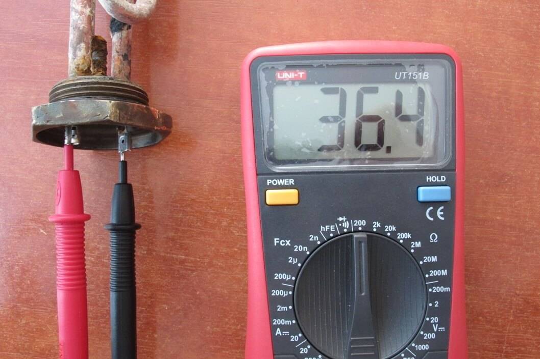 Также с помощью мультиметра, вам необходимо проверить ТЭН на пробой. Для подобной работы устройство необходимо перевести в режим зуммера. Одним щупов вам необходимо дотронуться до вывода, а вторым до нагревательного элемента. На фото ниже вы можете увидеть, как правильно проверить ТЭН на пробой.