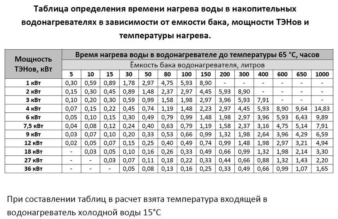 Чем мощнее электрообогреватель, тем быстрее он подогревает заданное количество воды. Поэтому приборы по этому параметру подбирается в соответствии с задачами, необходимым объёмом и допустимым временем ожидания. Так, например, нагрев до 60°С 15 литров с нагревателем в 1,5 кВт займёт около полутора часов. Однако для больших объёмов (например, для наполнения 100-литровой ванны) при разумном времени ожидания (до 3 часов) для доведения жидкости до комфортной температуры понадобится устройство на 3 кВт мощнее.