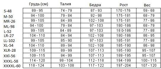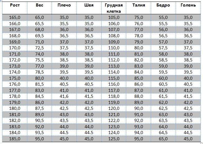 | Рост | Вес | Плечо | Шея | Грудная клетка | Талия | Бедро | Голень |
