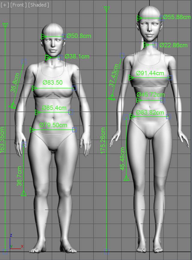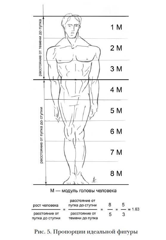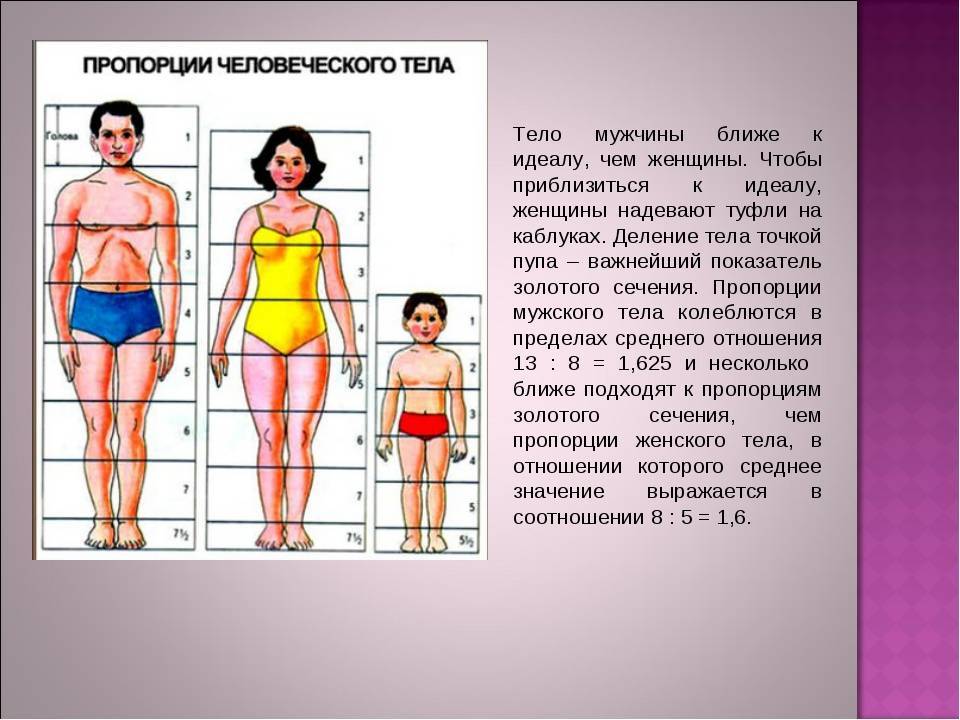Если брать античные статуи, их размеры более приближены к естественным параметрам, что объясняется правилом “Золотого сечения”, выведенного учёным древности Пифагором. А, исходя из него, совершенство должно определяться следующими пропорциями для обоих полов: