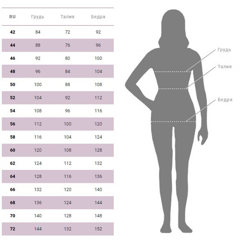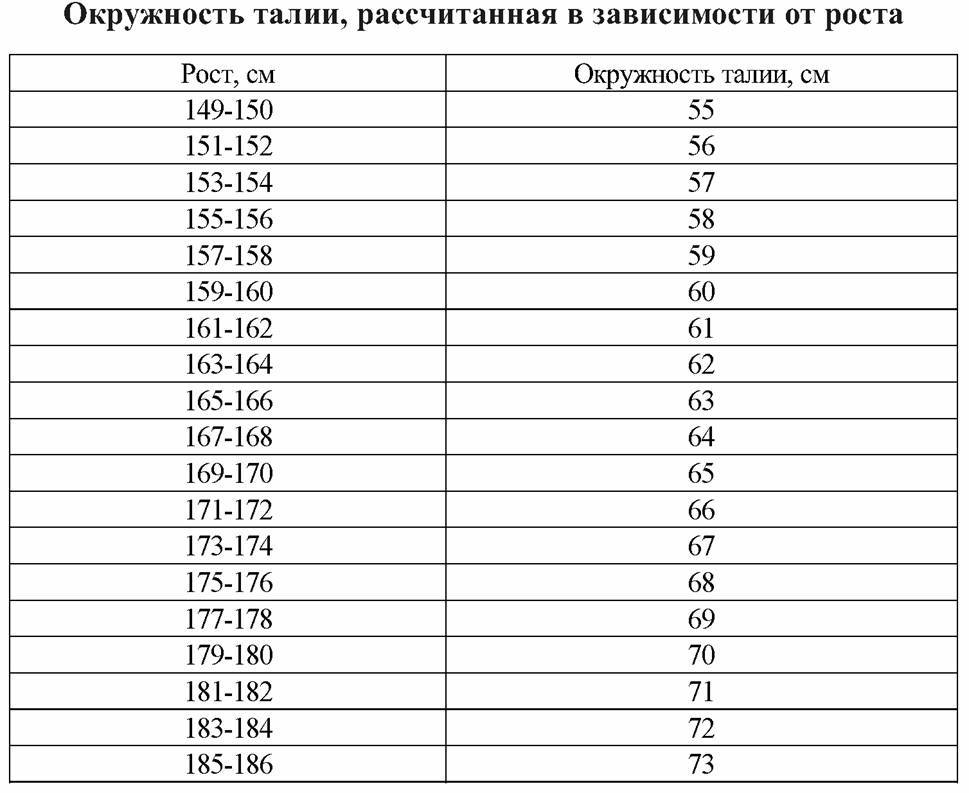 | Талия | Замер производится в самом узком месте — примерно там, где заканчивается грудная клетка, ребра |