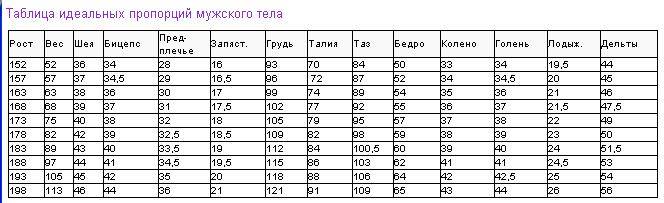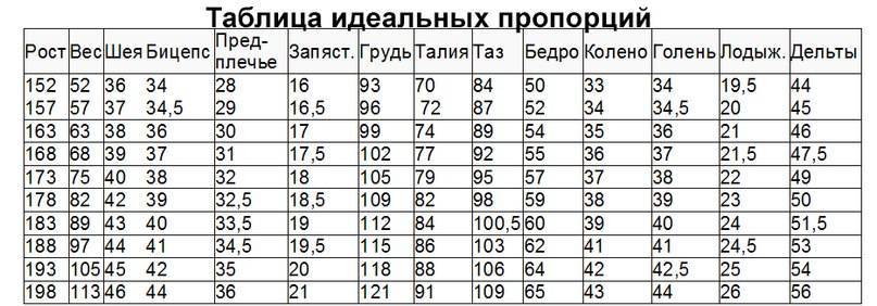 Джо Уайдер, известный бодибилдер и тренер, который в свое время тренировал многих известных культуристов, составил собственную таблицу идеальных параметров: