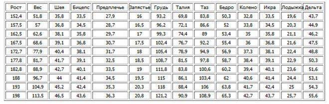 | Вес/Рост | Шея | Бицепс | Предплечье | Грудь | Талия | Таз | Бедро | Голень |