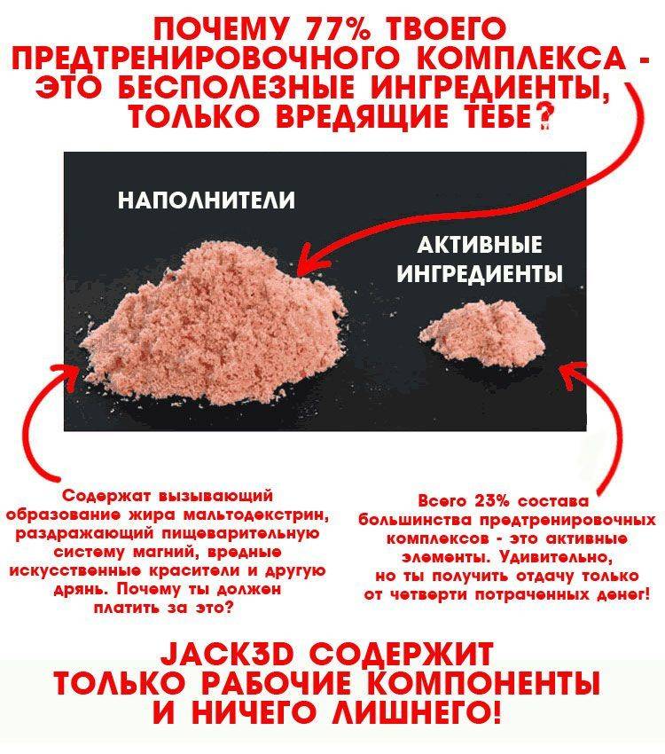 Таким образом, принимая порцию jack3d, вы получаете наиболее важные и полезные компоненты – лимонник, герань (диметиламиламин), бета-аланин, креатин моногидрат и аргинин. Есть и еще ряд компонентов, но они в большей степени несут вспомогательную функцию.
