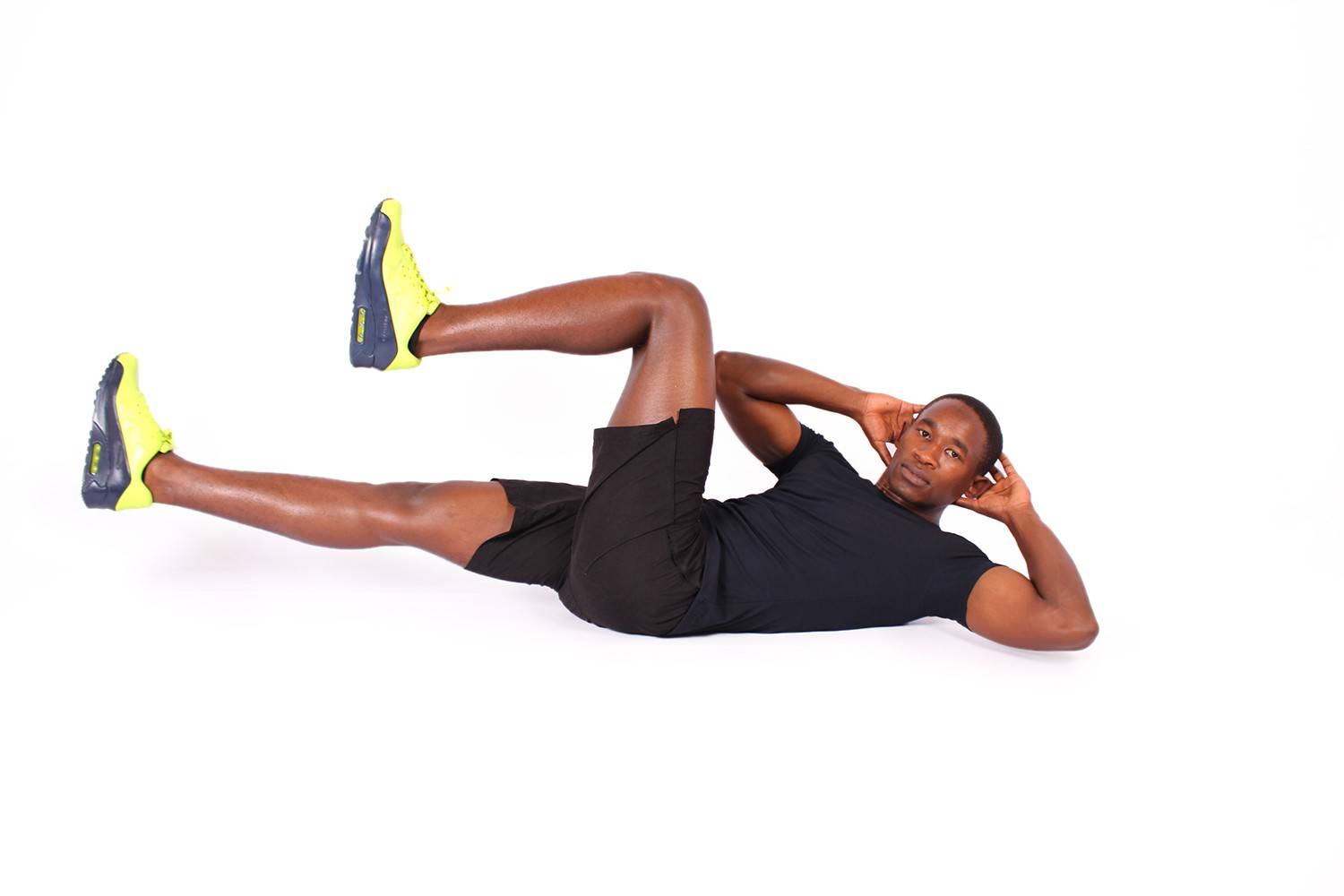 2. Руки держите у висков. Ноги удерживайте на весу, согните в коленях.