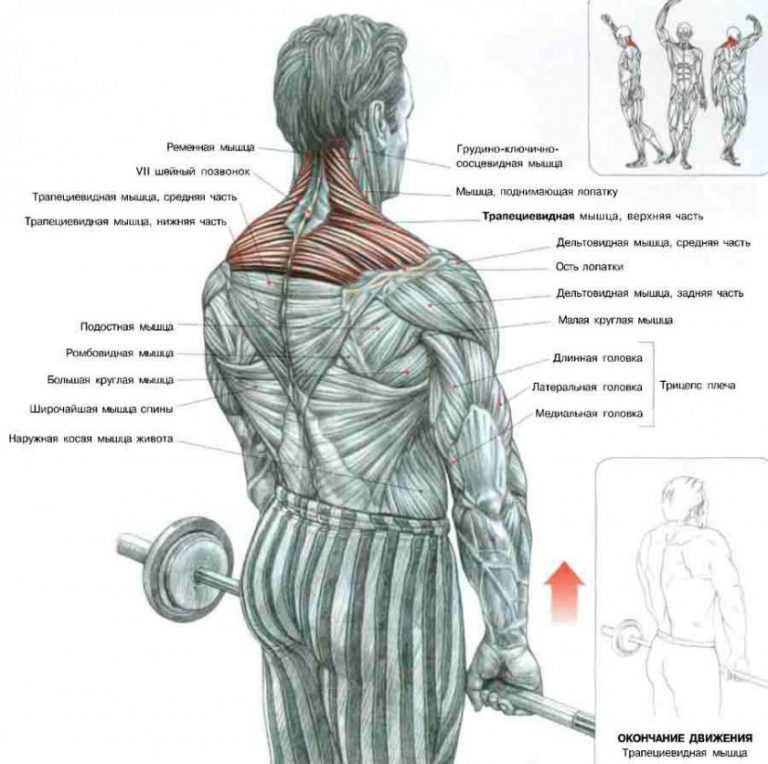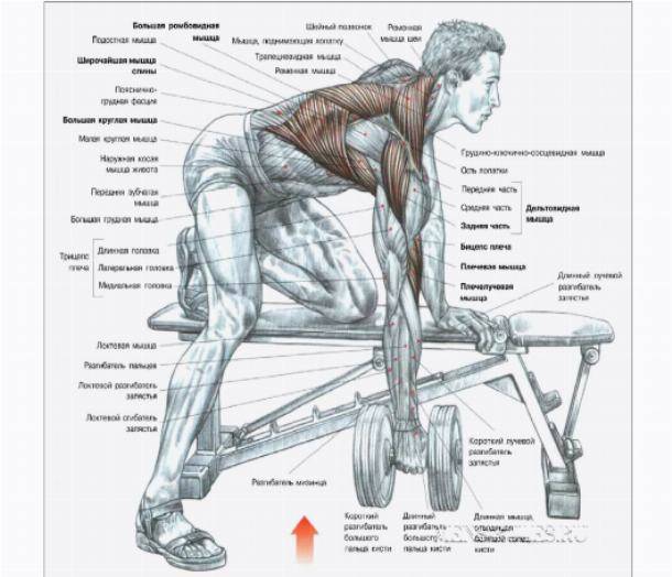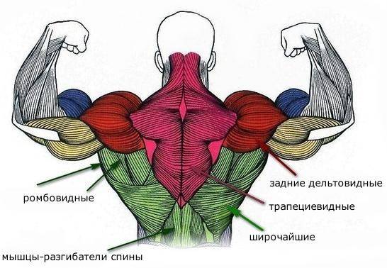 Широчайшие мышцы спины. В зале часто слышно «качаем крылья», а значит речь идёт именно о широчайших. Это самые тренируемые мышцы, они способны образовать V-образную форму фигуры для мужчины. Работают в различных упражнениях для спины с гантелями, подтягиваниях, выходах ввысь с рывком.