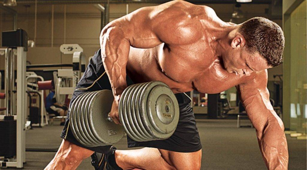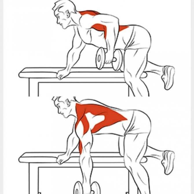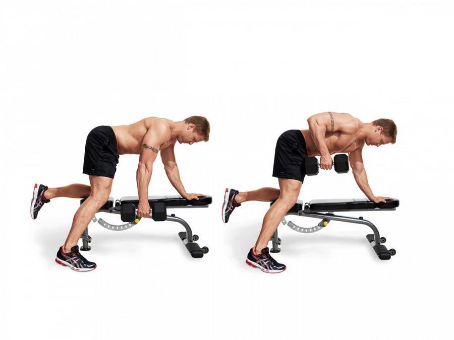 - Тяги гантелей одной рукой с упором. Это движение является изолированным и во многом похоже на предыдущее. Одну ногу вам необходимо расположить на опоре, например, скамейке. Также упритесь в нее и одноименной рукой. Гантель находится во второй руке со стороны опорной ноги. Корпус наклонен вперед до параллели с землей. Из этой исходной позиции начинайте выполнять тяги спортивного снаряда в направлении талии.
