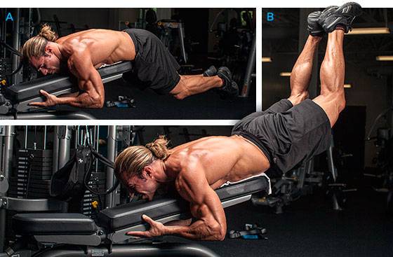 - Лягте торсом на скамью, а нижнюю часть свесьте вниз. Держась за скамью, ноги медленно поднимайте вверх до параллельности с торсом. Зафиксируйтесь на 4-5 сек. Не спеша опустите ноги. Выполните 8 раз.