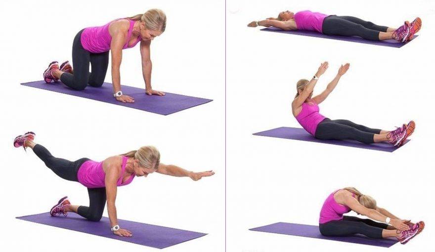 - Опуститесь на четвереньки, выдыхая, соедините правое колено с локтем левой руки и выгните спину. На вдохе обязательно вытяните руку вперед и ногу назад, а спину прогните. Выполняйте чередуя руки и ноги 10 раз.