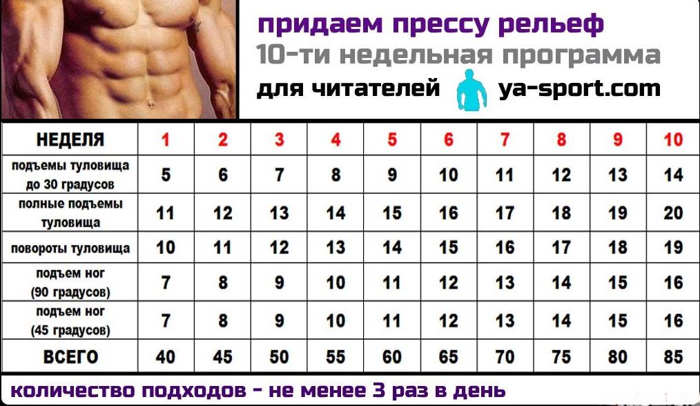 Мышцы пресса ничем не отличаются от остальных мышц нашего организма и соответственно принципы их тренировки будут примерно одинаковы (см. «Основные принципы роста мышечной массы»). Вы же не делаете 100 подъемов на бицепс, чтобы добиться увеличение его размеров. Так почему мышцам пресса это надо? То же количество повторов, что вы делаете для других мышечных групп (не более 15), также актуально и для пресса.