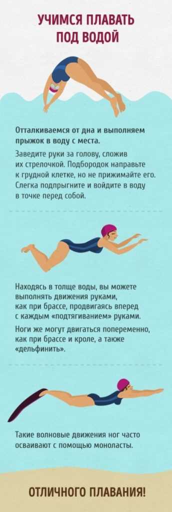 Втяните воздух, задержите дыхание и сядьте в воду, притянув колени к грудной клетке, а голову — к коленям. Досчитайте до десяти и всплывите вверх спиной, выдохните и встаньте на ноги