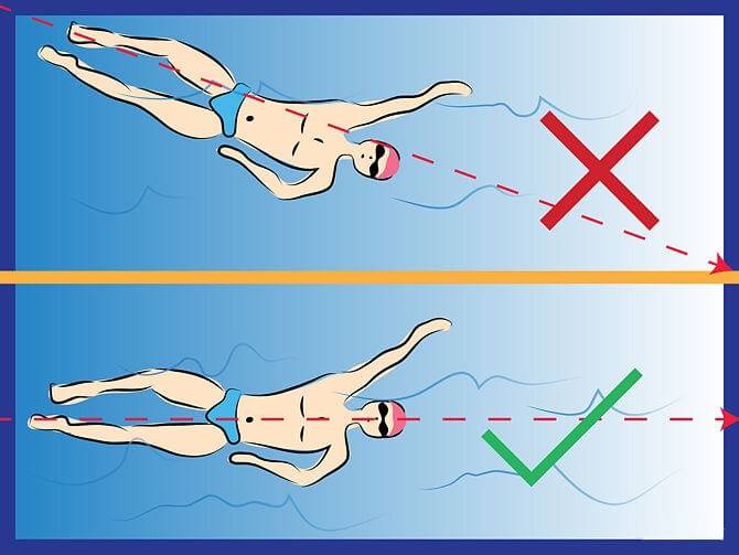 Для максимальной скорости тело должно располагаться горизонтально. Не смотрите вперед или на потолок. Взгляд направлен вниз, а вовремя повороты головы — к краю бассейна.
