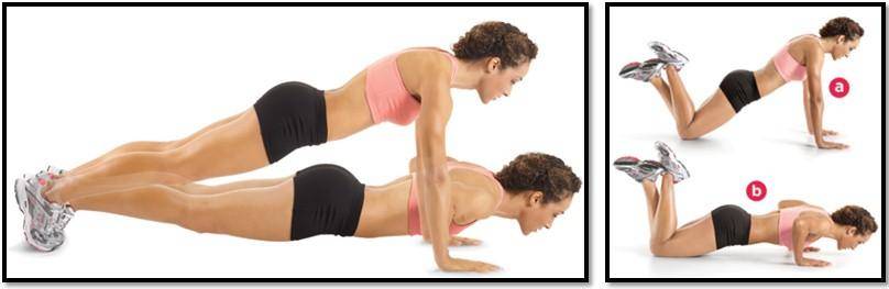 4. Обычные отжимания от пола также помогают укрепить мышцы: выполняя их, нужно стараться держать корпус прямо, не поднимая туловища. Точкой опора могут служить и согнутые колени. Выполнять не менее 10 раз.