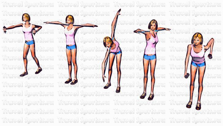- 5.Наклоны. Обычные наклоны в стороны всегда эффективны для похудения боков. Но выполнять их надо правильно: ноги на ширине плеч, руки на талию, начинать наклоны в разные стороны, направляя туда же и противоположную руку.