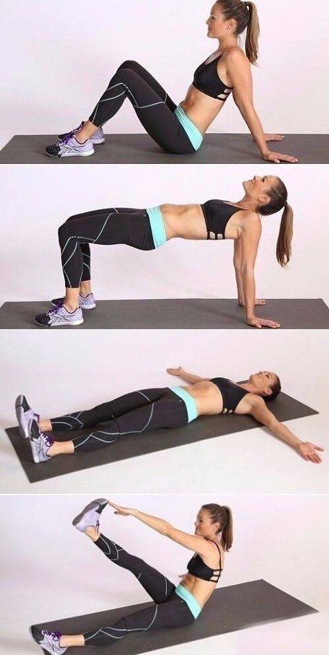 - 3.Лечь на спину, ноги согнуть. Таз поднимается вверх, бедра сжимаются, задержаться нужно на пять секунд. После недели тренировок можно пытаться встать на мостик и делать березку.