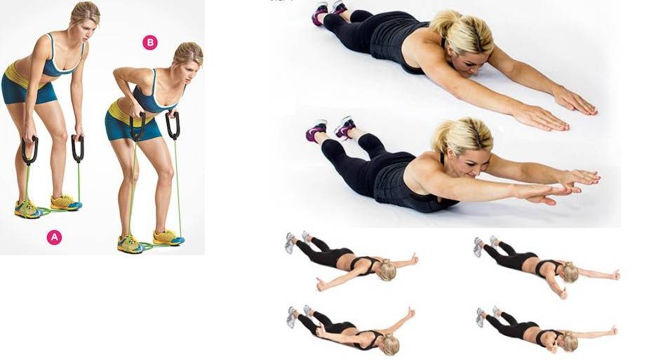 Упражнение лодочка выполняется лежа на животе с вытянутыми вперед руками и соединенными вместе ногами. Оно укрепляет мышечный корсет спины, плеч, живота, боков, помогает бороться с лишними килограммами в зоне поясницы. Поднимите руки и ноги вверх, совершая прогиб в пояснице. В пике напряжения мышц задержитесь несколько секунд, а потом вернитесь в исходное положение. Повторите 20 раз.